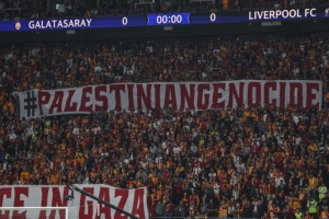 体育资讯10月3日讯 《巴黎人报》报道,在加拉塔萨雷1-0战胜利物浦的欧冠比赛中,加拉塔萨雷球迷拉出许多横幅,声援巴勒斯坦民众。