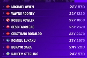 英超参与100球最年轻球员排名: