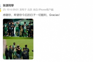 体育资讯10月6日讯 昨晚,北京国安俱乐部官方宣布主帅塞蒂恩离任。国安球员张源更新个人微博,向塞蒂恩送上祝福。