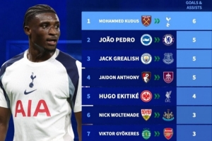 体育资讯10月9日讯 德国转会市场盘点了英超新援参与进球数据,库杜斯参与6球排名第一。