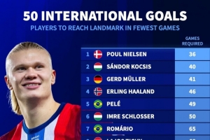 国家队最快达50球所用场次:哈兰德46场第4、梅西107场和C罗114场