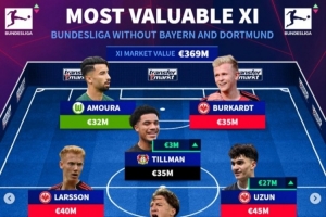 中场:詹-乌尊(法兰克福,4500万欧)、斯蒂勒(斯图加特,4500万欧)、雨果-拉尔森(法兰克福,4000万欧)、蒂尔曼(勒沃库森,3500万欧)